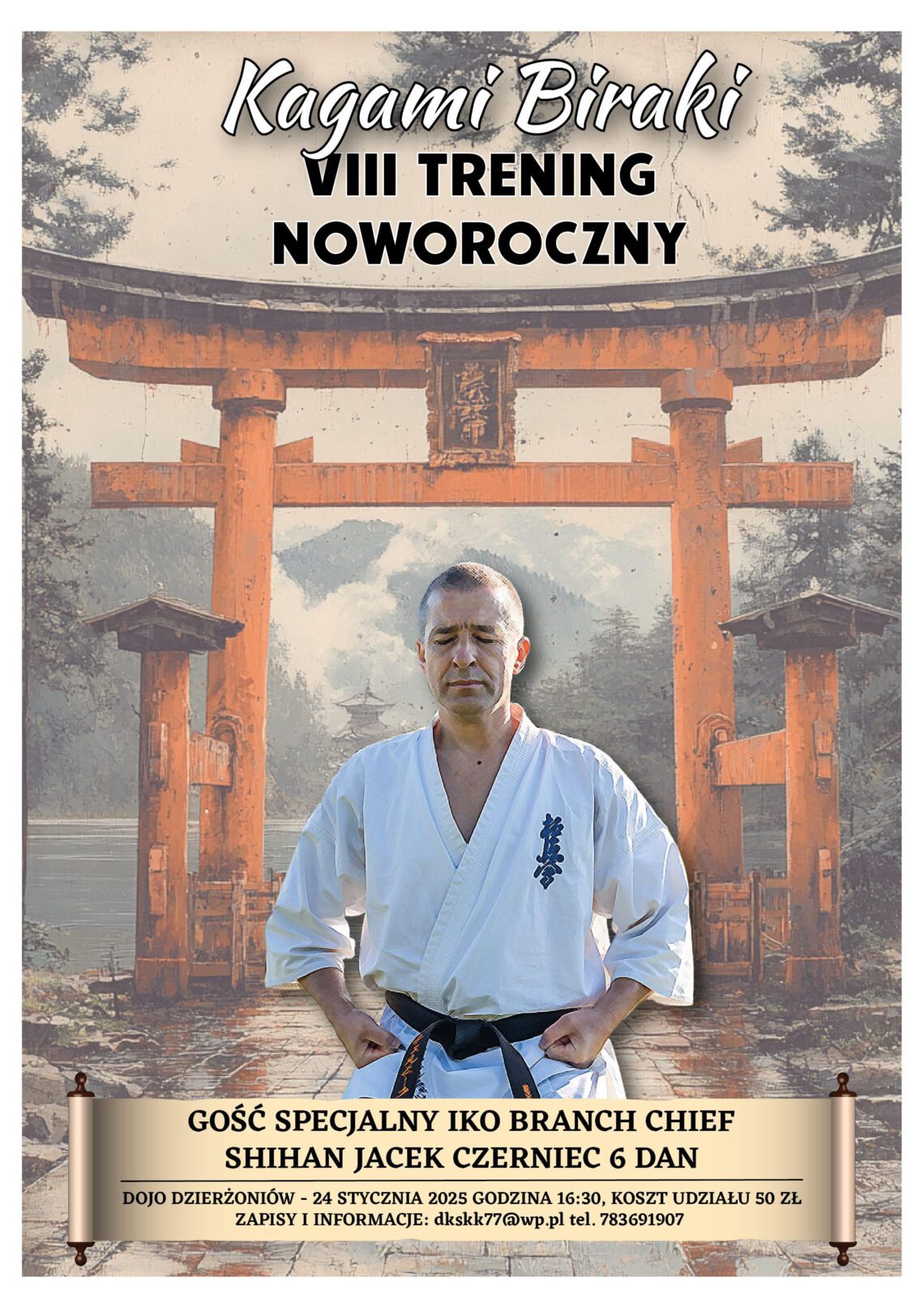 WIADOMOŚCI KAGAMI BIRAKI – VIII Trening noworoczny 2025-01-10 KAGAMI BIRAKI VIII Trening Noworoczny Termin: 24.01.2024r. Miejsce: Dojo Dzierżoniów os. Jasne 23 Koszt: 50 zł Prowadzący: shihan Jacek Czerniec Plan: 16:30 trening dla dzieci do 13 roku życia 17:30 Wręczenie certyfikatów oraz plebiscyt na najlepszego zawodnika DKSKK 18:00 trening dla zaawansowanych Poprzedni PRZERWA ŚWIĄTECZNA Nowsze TUŻ ZA PODIUM NA ICHIBAN IKO POLISCH CUP Zobacz również GRAFIK PODCZAS FERII ZIMOWYCH 2024-01-17 TURNIEJ MIKOŁAJKOWY W ZĄBKOWICACH ŚLĄSKICH 2023-11-25 SUMMER CAMP 2024-08-19 Dodaj komentarz Anuluj pisanie odpowiedziTwój adres e-mail nie zostanie opublikowany. Wymagane pola są oznaczone *Nazwa * Adres e-mail * Witryna internetowa Zapamiętaj moje dane w tej przeglądarce podczas pisania kolejnych komentarzy. Komentarz