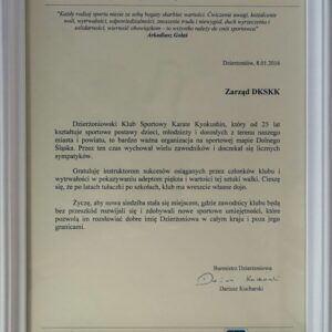 Zarząd DKSKK oraz zawodnicy serdecznie dziękują instytucjom, które nas wspierają i naszą działalność: Urzędowi Miasta Dzierżoniów, Starostwu Powiatowemu w Dzierżoniowie, Urzędowi Gminy Wiejskiej Dzierżoniów, Urzędowi Miasta i Gminy Pieszyce oraz sponsorom i rodzicom. Na tą okoliczność w klubie są wykonane tablice informacyjne o na których są umieszczone osoby prywatne ,instytucje oraz firmy wspierające klub.
